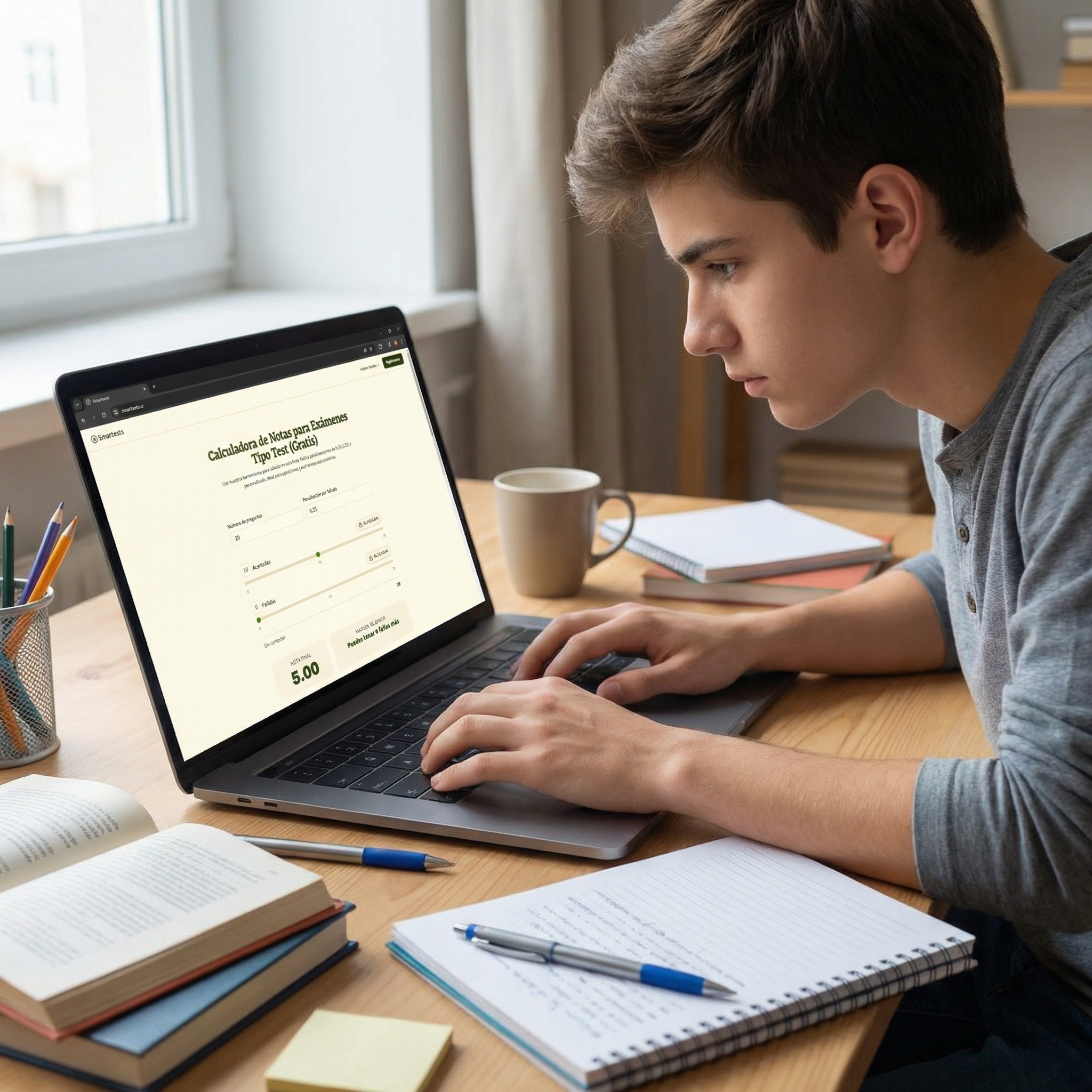En nuestra web tienes una Calculadora de Nota de Examen Tipo Test totalmente gratuita. Solo tienes que introducir los datos que ya hemos visto (aciertos, errores, total de preguntas, etc.) y te dará tu nota al instante.
